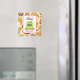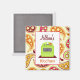 Ein Küchenmagnet mit der Darstellung eines hellgrünen Retro-inspirierten Ofens auf einer bordeauxfarbenen Oberfläche mit einem orangefarbenen Kochtopf auf der rechten Vorderseite. Das Untergeschoss besteht aus orangefarbenem, goldfarbenem, rosa, grünem und bordeauxfarbenem Paisley. Personalisieren Sie mit Ihrem Namen.