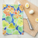 Ein hübsches, sommerliches Küchentuch, das jede Küche aufhellen lässt. Handgemalte Tuch und orangefarbene Nisturgen auf himmelblauer Basis, von Judy Adamson in Aquarellmalerei.