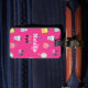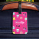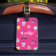 Ein Gepäckanhänger mit einem Muster bildete sich mit Make-up, Schönheit und Produkte wie Parfüme, Gesichtsbehandlungs- und skincarelotionen, Lippenstifte, Nagellacke, Haartrockner, Kamm und Spiegel pflegend. Bunt, trendy und Chic mit Farben von rosa und von Lila für die girly Touch! Heller rosa Hintergrund! Personifizieren Sie mit dem Namen des Mädchens.