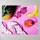 Ananas, Bananen, Flipflops, Sonnenbrille und Saft auf rosa Untergrund