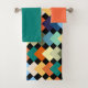 Dieses Set ist mit einem orangefarbenen Waschlappen, einem türkisfarbenen Handtuch und einem Badehandtuch mit einem geometrischen Design aus hellen Diamanten ausgestattet, die sich auf einem schwarzen Feld überlagern.