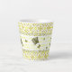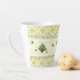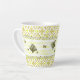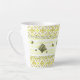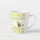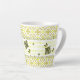 Hellgelbe Tee-Tasse mit Akkordeons, Schmetterlingen und Musikmustern.