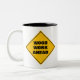 Hellgelbes Holz vor dem Warnschild Zwei Zweifarbige Tasse