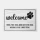 Hellgraues Holz Willkommenspfow lustige Zitate Vintag Doormat. "Ruft die Glocke an und lasse den Hund entscheiden, ob er dich mag" Zitat auf Doormat. Perfekte und komfortable Unterkunft für Hundefreunde und Liebhaber von Haustieren. Zitat ist im Vintagen Schriftart und willkommen ist im Skript-Schriftart mit Pfow.