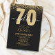Hello 70! Invite your friends and family to celebrate the 70th birthday with this modern design. The design features a black background, the numbers thirty in faux gold glitter, with an elegant glitter gold background, elegant calligraphy, a modern birthday template that is easy to customize, and the option to add a photo on the reverse. Don't think twice and get yours now.