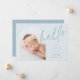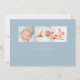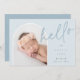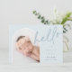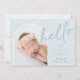 Die elegante Foto-Geburtsankündigung mit einzigartigem Layout, mit einem vertikalen Foto in gewölbter Form auf weichem, staubblauen Hintergrund, mit "hallo" überlagert in handgeschriebener Schrift Typografie. Personalisieren Sie Ihre Babynahrung, Ihr Geburtsdatum und Ihre Geburtsdaten, und fügen Sie eine persönliche Nachricht auf den Rücken hinzu, zusammen mit drei weiteren quadratischen Fotos.