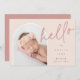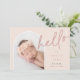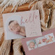 Die elegante Foto-Geburtsankündigung mit einzigartigem Layout, mit einem vertikalen Foto in gewölbter Form auf einem weichen, staubigen Rose-Rosa-Hintergrund, mit "hallo" überlagert in handgeschriebener Schrift Typografie. Personalisieren Sie Ihre Babynahrung, Ihr Geburtsdatum und Ihre Geburtsdaten, und fügen Sie eine persönliche Nachricht auf den Rücken hinzu, zusammen mit drei weiteren quadratischen Fotos.