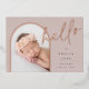 Diese elegante Foto-Geburtsankündigung mit einzigartigem Layout weist ein vertikales Foto in gewölbter Form auf einem sanften, neutralen Erdtonhintergrund auf, mit "Hallo" in der Rose mit Goldfolienschrift und Schriftzypografie. Personalisieren Sie Ihre Babynahrung, Ihr Geburtsdatum und Ihre Geburtsdaten, und fügen Sie eine persönliche Nachricht auf den Rücken hinzu, zusammen mit drei weiteren quadratischen Fotos.