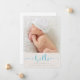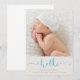Diese einfache, aber elegante Geburtsankündigung enthält das Wort "hallo" in einer hellblauen, modernen Schrift-Typografie. Der untere Teil der Karte hat einen gerissenen, papierartigen Look, während oben das neue Foto der Bundles angezeigt wird. Personalisieren Sie die Geburtsdetails des Babys.