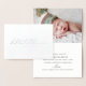 Moderne, elegante Geburtsankündigung mit den Worten "Hallo Kleine" in einem modernen Drehbuch in realer Folie auf der Vorderseite, optionale Zeile darunter (anpassen oder löschen Feld, wenn gewünscht) und Geburtsinfo zusammen mit einem Foto im Inneren.