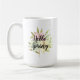 Hübsche Frühlingskaffee-Tasse mit rosa, gelben und grünen pastellfarbenen Blume und Blätter. "Hello Spring" steht in einer hübschen Typografie an vorderster Front.