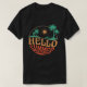 Dieser schwarze T - Shirt enthält den Text "HELLO SUMMER" in einem runden, welligen Schriftart mit orangefarbenen und roten Farbverläufen, Set in einer kreisförmigen Grafik. Die Grafik zeigt eine Strandlandschaft mit Palmen, dem Ozean, einer untergehenden Sonne und einer gekrümmten Horizontlinie. Das Design feiert die Ankunft von Sommer- und Strandvibes.