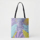 Lavendel Hintergrund mit tropischem Blattwerk in Pastellfarben blau, rosa und Limon mit dem benutzerdefinierten Drehbuch "Hallo Summer". Die perfekte Tasche für Ihre Sommerausflüge und alles, was Sie für einen Tag am Strand oder einfach nur für ein reines Shopping benötigen.