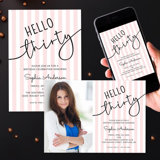 Hello Thirty Modern Script Chic Stripes BirthdayDesignt von Linda Terwee