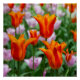 Niedliche, helle Orangentulpen im Park an einem sonnigen Tag im Garten. Hintergrund für die Erholung. Kleine Kosten - viel (Meer) positiv für das Team. Geeignet für einen Raum (Ort) der Entspannung während der schwierigen Stunden. Positiv und gute Einstellung zur Arbeit. Kann als Hintergrund für ein Selfie verwendet werden. Das Foto wurde im Juni 2022 aufgenommen. Das Poster ist für die Innenarchitektur geeignet.