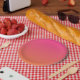 Hell rosa bis orange glänzend Solid-Design. Lebhaftes und farbenfrohes, hellrosa Omelett-Farbdesign. Von Kierkegaard Design Studio.