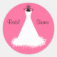 Trendy, hellrosa Aufkleber, mit hübscher Grafik eines weißen Hochzeitskleides, auf einem schwarzen Kleiderbügel. Schwarzer, benutzerdefinierter Text liest Brautparty und ist bereit, um zu personalisieren, um alles, was Sie möchten lesen. Großartig wie Siegel zu Ihren Brautdusche Einladungen.