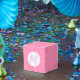 Feminines hellrosa und weißes Design im Fraktal der gewellten Quadrate. Fügen Sie eine Initiale zur Personalisierung für Ihre Party oder Veranstaltung hinzu. Würfelförmige Favor-Schachtel, geeignet für fast alle Anlässe.