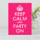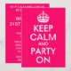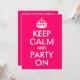 Anpassbare Textbereiche auf einer hellrosa-weißen Parodie "Behalt Calm and Party On" für eine Geburtstagsparty.