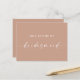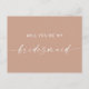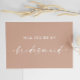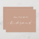 Mit dieser minimalistisch blassrosa Karte laden Sie Ihre zukünftige Brautjungfrau auf eleganteste Weise ein. Diese Flachkarte mit einem weichen Hintergrund und einer sauberen, modernen Typografie ist eine einfache und doch herzliche Art, die Frage zu Pop. Ideal, um in eine Vorschlagskiste zu schlüpfen oder als Überraschung per E-Mail zu versenden. Der Text auf der Rückseite ist vollständig editierbar.