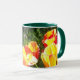 Eine helle und fröhliche Ringer-Tasse mit Hunter Green Lippe und Hunter und orangefarbenen, roten und gelben Tulpen, von einem Foto von Judy Adamson.