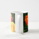 Eine helle und fröhliche Ringer-Tasse mit Hunter Green Lippe und Hunter und orangefarbenen, roten und gelben Tulpen, von einem Foto von Judy Adamson.