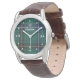 Stilvolle Armbanduhr aus Leder, mit dem klassischen aquamarinen Clan Henderson Tartan kariertes Muster, auf dem Gesicht, mit weißen Zahlen und Punkten für die Stunden. Weiße benutzerdefinierte Text liest Henderson, und kann personalisiert sein, zu lesen, was Sie gewollt.
