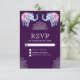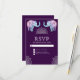 Elegante RSVP-Karte mit eleganter Henna-Kunst und wunderschön dekorierten Elefanten vor einem dunklen lila Hintergrund.