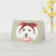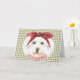 Henrietta stammt ursprünglich aus Havanna, Kuba, und belegt derzeit jeden Raum, den sie in ihren Penthouse-Ziffern auf der Upper East Side wählt. Digitales Aquarellbild Havenese Hundeportrait mit Perlen und Bogen, auf klassischem Herringbone-Muster Hintergrund
