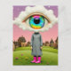 A surreal woman in a grey sweater and pink boots with her head in the clouds and a giant eyeball