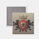 Mittelalterlicher Löwe Heraldry Magnet. Ein Wappen-Design mit zwei Löwen, einem Schild, einer Krone und einem Flir-de-lis. All dies war während des Mittelalters in Europa sehr symbolisch. Heraldry hatte auf ihrer Rüstung und ihren Waffen Bilder mächtiger Kreaturen wie Löwen, Drachen und Greifen. Es war eine Möglichkeit, Kämpfer auf dem Schlachtfeld zu identifizieren.