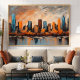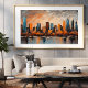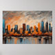 Dieses Plakat zeigt ein abstraktes Acrylgemälde, das bei Sonnenuntergang ein Stadtbild wunderschön einfängt. Das Stadtbild besteht aus kühlen, geometrisch geformten Gebäude, die vor dem Hintergrund eines dramatischen Himmels hoch stehen. Die Gebäude in Blau, Grau und Schwarz verleihen der Szene ein Gefühl von Tiefe und Dimension. Das von Bäumen gesäumte Ufer fügt der urbanen Landschaft eine Touch der Natur hinzu. Die Bäume, die in einem lebhaften Orangenschatten geschmückt sind, deuten auf die Herbstsaison hin. Die Gebäude und Bäume werfen ihre Reflexionen ins Wasser und erzeugen einen spiegelähnlichen Effekt, der die visuelle Gesamtwirkung des Gemäldes verstärkt. Der Himmel ist ein Spektakel an sich, mit einer dramatischen Mischung aus Grau, Orange, Weiß und Blau. Die Farben des Himmels scheinen sich mit der untergehenden Sonne zu verändern, was der Szene ein Gefühl der Dynamik verleiht. Das Gesamtfarbthema der Skyline ergänzt die Farben des Himmels und des Ufers und schafft so ein harmonisches visuelles Erlebnis. Dieses moderne Kunstposter mit seiner abstrakten Darstellung einer Stadt bei Sonnenuntergang wird die Zuschauer mit seinen kühnen Farben, dramatischen Bildern und seinem künstlerischen Flair sicher begeistern. Es ist ein Zeugnis für die Schönheit, die sich in urbanen Landschaften und den sich verändernden Jahreszeiten findet. Ob Sie ein Kunstfreund sind oder einfach jemand, der schöne Szenen schätzt, dieses Poster wird sicher eine tolle Ergänzung zu Ihrer Zuhause machen.