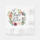 Die Hochzeitsnapkins enthalten Drehbücher mit dem Drehbuch "Fall in Liebe", gerahmt durch einen Kranz aus wunderschönen Rose, Dahlien, Blume und Grünpflanzen, in einer herrlichen Herbstpalette aus bordeauxrot, goldgelb, pfirsichfarben, rosa, rot und grün.