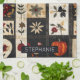 Dieses Küchentuch ist mit einem Volkskunstwerk-Quilt-Stil ausgestattet, das in einem Gitter von Herbst- und Naturmotiven angeordnet ist. Hervorzuheben sind die Orangenkürbis, die stilisierten Blume, die Weinmuster, das rote Herz mit cremefarbener Kontur und der polka-gepunktete Vogel, das Set in kontrastierenden schwarzen, cremefarbenen und warmen Erdtönen wie Orange, Rot und Braun. Die abwechslungsreichen Texturen lassen Appliqué, Stickereien oder traditionelle Quiltiertechniken vermuten, die dem Design ein behagliches, handgefertigtes Gefühl geben. Dieses elegante Hotel im rustikalen Landhausstil ist ideal für Herbstdekore, Erntedank, Kunsthandwerk und primitive Volkskunstler.