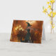 Eine Hexe mit grünem Kleid und fließendem Ingwerhaar, die einen Zauber auf einen reichen herbstfarbenen Hintergrund mit Kauldron, Broomstick und schwarzer Katze ausstrahlt.