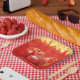 Ein lustiger und wunderschöner Teller für ein kanadisches Apfelherbst Party-Fest. Gut zum Geburtstag oder zum Zusammenkommen. Die Farben sind Rot, Gelb und Orangen.