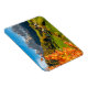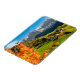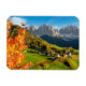 Der rechteckige Foto-Magnet einer Kirche und der Ortschaft St. Magdalena in Villnoess in einer märchenhaften Landschaft mit majestätischen Dolomiten-Bergen im Hintergrund und Blätter in Herbstfarben im Val di Funes in Italien.