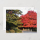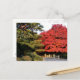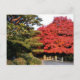 Roter Kiefernbaum kontrastiert mit einem großen Scharlachrot japanischen Ahorn über einer kleinen Brücke