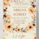Herbst in der Liebe pfirsichfarbene Grenze und Kiefernfüße boho alle in einer Hochzeitseinladung. Der ovale Rahmen besteht aus einer wunderschönen Zusammensetzung aus Ästen, peronischen Blüten, Nadelkronen, getrockneten Botanikalen und Blätter, die alle in einer warmen Farbpalette aus Pfirsich, Braun, Gold und Graugrün gehalten sind. Die Phrase "FALL in Liebe" wird wunderschön in einer bezaubernden Mischung aus Schrift und eleganter Typografie dargestellt und fügt eine herzliche Touch hinzu. Diese Einladung verbindet rustikale Eleganz mit fließender Aquarellkunst und macht sie zur idealen Wahl für eine raffinierte, naturlich inspirierte Herbsthochzeit.Die Einladung ist eine All-in-One-Karte, die die Einzelheiten Ihrer Hochzeit und UAWG enthält.