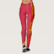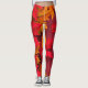 Beinpaare mit Leggings mit rotem Hintergrund und roten und orangefarbenen Blätter, schwarz-weiße Turnschuhe.