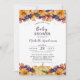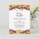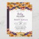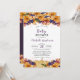 Diese Herbstwald Rustic Baby Dusche Einladung im Herbst blühende rustikale Orangen- und Wildbeeren, Waldzweige und Blätter, ein kleiner Kürbis und goldene Tropfen . Die Rückseite ist eine lila, kräftige Farbe mit Herbstfarben.