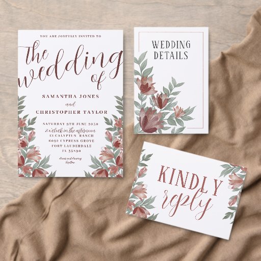 Wunderschönes Design Herbst/Hochzeit im Herbst, mit Terrakotta und gebrannten orangen Blumenelementen mit abgestimmtem Blattwerk. Modernes und elegantes Design, das ist die perfekte Einladung für Sie, sich anzupassen.