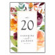 Die Herbstkarte mit ihren Blume im Herbst und dem modernen, raffinierten Design besticht durch ihre Tischnummer. Die Aquarellfarben umfassen Rose in Pflaumentönen, Aprikosen und Pfirsichtönen. Auch die Tischkarte wird von Fall Foliage geschmückt. Die Vorder- und Rückseite der Karte sind identisch, um den Gästen das Auffinden ihres Tisches zu erleichtern. Der Platz unten auf der Karte erlaubt es, einen Kartenhalter zu beherbergen, ohne den Text zu verdecken.