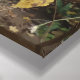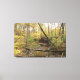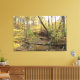 Ruhiges und landschaftliches Herbstbild eines mittelwestlichen Waldbaches, bei dem ein gefallener Baum die Bucht überquert und ein schiefer Baum Winkel bildet. Gelbe dezidiöse Blätter und braune Baumstämme mit Sprinklen grüner Blätter. Genießen Sie das ganze Jahr über eine landschaftliche Waldlandschaft. Leinwand Wanddekoration in verschiedenen Größen.