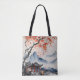 Helle, orangefarbene und rote Herbstblätter wandern um einen Tempel neben einem Bergsee auf dieser schönen Totentasche, die das Konzept von wabi-sabi illustriert.