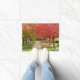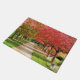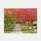 Ein farbenfrohes Foto von Bäumen entlang eines friedlichen Weges mit Bänken.