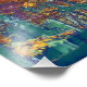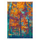 Ein gemaltes Bild von Bäumen im Herbst, in kühnen Gelb-, lila-, Orange- und aquamarin-Farbtönen.