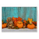 Eichhörnchendekoration in Herbstlauben und Mini-Kürbis auf rustikales Holz