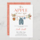 Genießen Sie Ihren kleinen Apple of Our Eye Baby Shower Einladung! Dieses warme Design besticht durch eine skurrile Aquarelltüte, die mit Babykleidung, üppiger Vegetation und saftigen roten Äpfeln geschmückt ist und sich perfekt für eine Herbstfeier oder eine rustikale Dusche eignet.