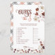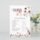 Gönnen Sie Ihren Gästen dieses unterhaltsame und interaktive Baby-Duschspiel "Guess The Price", das sich perfekt für jede Kinderfeier eignet. Mit eleganten Herbst-Blumenakzenten in reichen Herbsttönen versetzt diese Spielkarte die Gäste in die Lage, die Kosten für wichtige Babyartikel zu erraten. Es ist ein unterhaltsamer Weg, ihre Kenntnisse zu testen und lebendige Gespräche zu entfachen, um Ihren Babyduschfestlichkeiten eine angenehme Touch zu verleihen.